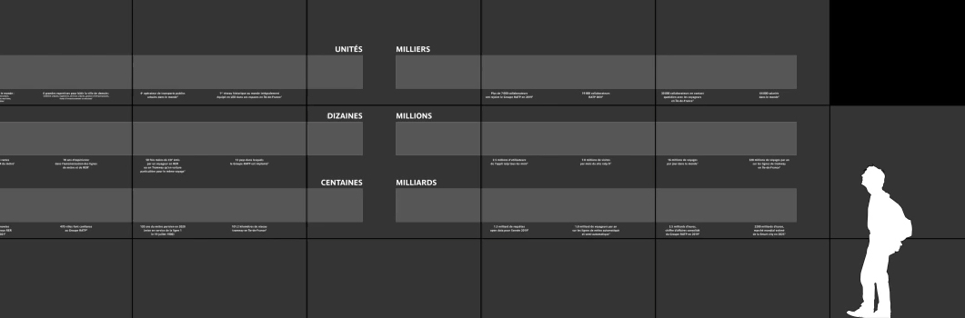 En 2019, nous avons été chargés par la RATP de créer une exposition visant à valoriser une vingtaine de chiffres clés du groupe, afin de rendre compte de son rayonnement en France et à l’international.