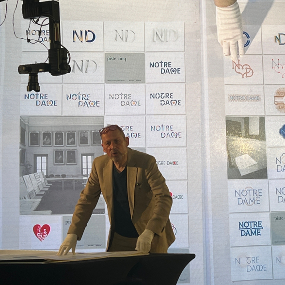 La réouverture de Notre-Dame-de-Paris est un moment unique. En 2019, l'agence a eu l’honneur de se voir confier la création de la nouvelle identité visuelle de la cathédrale (logo, typographie, signalétique…) Afin de la célébrer, c-album s’engage dans un cycle nouveau de conférences performées, les « tabula ». Celles-ci sont l’occasion de faire voyager l’identité visuelle en France et à l’étranger, selon des configurations modulables et en renouvellement permanent. Ces performances reposent sur la présentation de huit cahiers thématiques, présentant chacune de nos contributions à la conception de l’identité de ce lieu si singulier. En complément de ces présentations, des feuillets participatifs prenant la forme de workshop sont aussi développés, permettant à chacun d’imaginer, d’inventer, et de traduire ce que Notre-Dame peut évoquer.