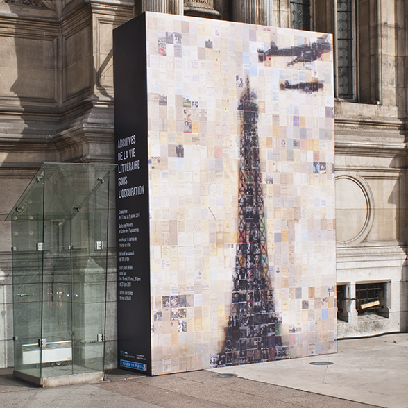 L’exposition « Archives de la vie littéraire sous l’Occupation » entendait présenter une masse de documents d’une incroyable richesse à l’Hôtel de ville de Paris : abondance et, dans le même temps, austérité puisqu’il ne s’agissait que de papiers (revues et livres, textes manuscrits ou imprimés, papiers d’identité, quelques photographies).