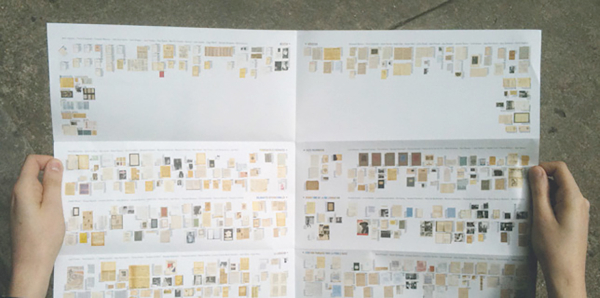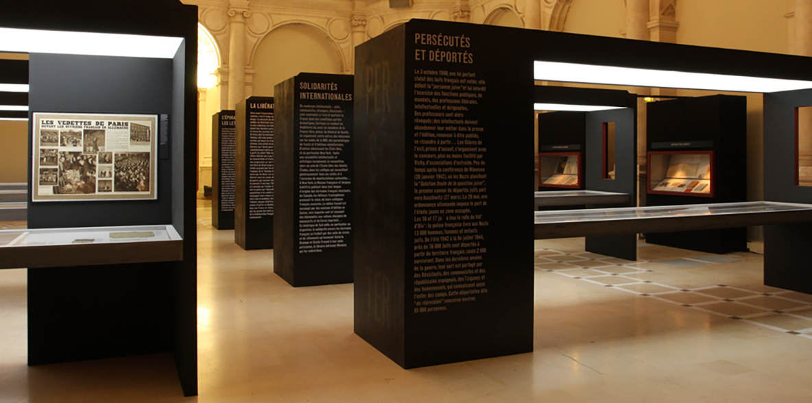 Notre travail consista d’une part à élaborer l’univers graphique de l’exposition elle-même (carte du Paris de l’Occupation, frise en reliefs indiquant, selon l’angle sous lequel elle était considérée, les différents pseudonymes des écrivains résistants, etc.), ainsi que les divers documents de communication (invitations, affiches, journal d’exposition, etc.).