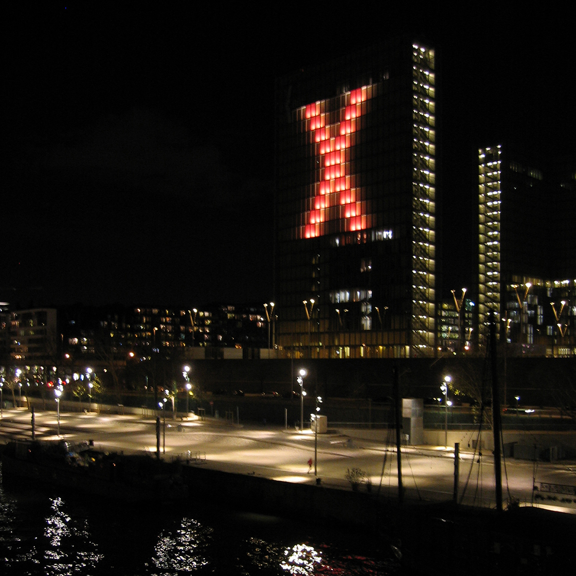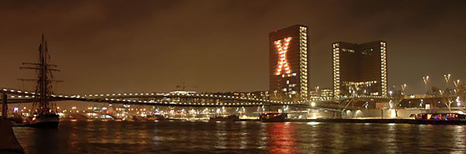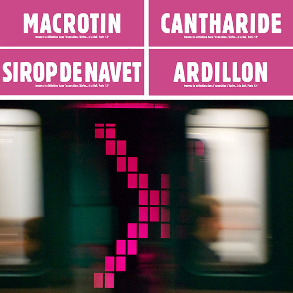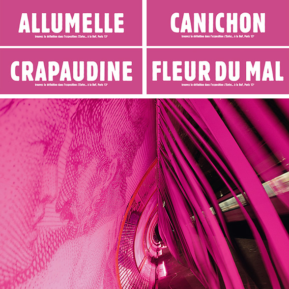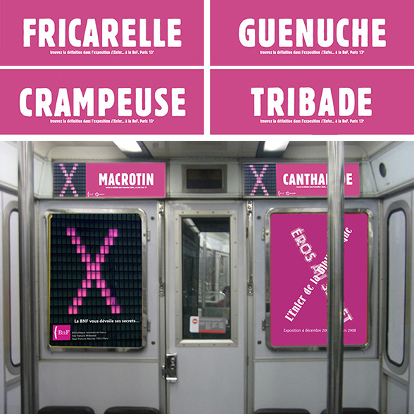 Ce fut l’un de nos plus gros projets, et certainement celui qui bénéficia du plus important battage médiatique. Pour la première fois, nous prenions en charge l’ensemble de la communication d’une exposition : outre les supports habituels (affichage, signalétique, catalogue, etc…), nous avons proposé deux évènements d’envergure. D’une part, nous avons installé le X rose géant sur la façade de la Bnf, symbole de l’enfer, cet espace où l’on regroupait les ouvrages licencieux. L’image, visible depuis l’espace aérien, marque les esprits, elle était pourtant le fait de moyens simples : 76 lampes, 38 drops et de l’adhésif.
