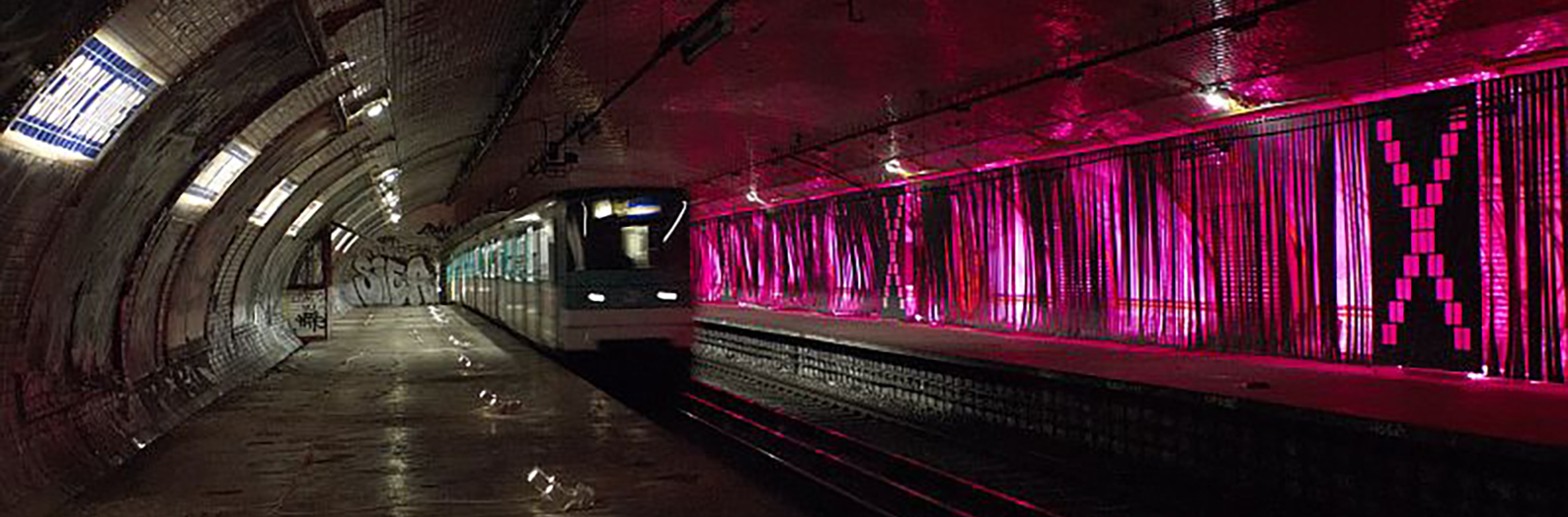 D’autre part, nous avons imaginé et créé l’habillage onirique de la station de métro fantôme Croix-Rouge, teaser fugace et fantasmatique de l’exposition.