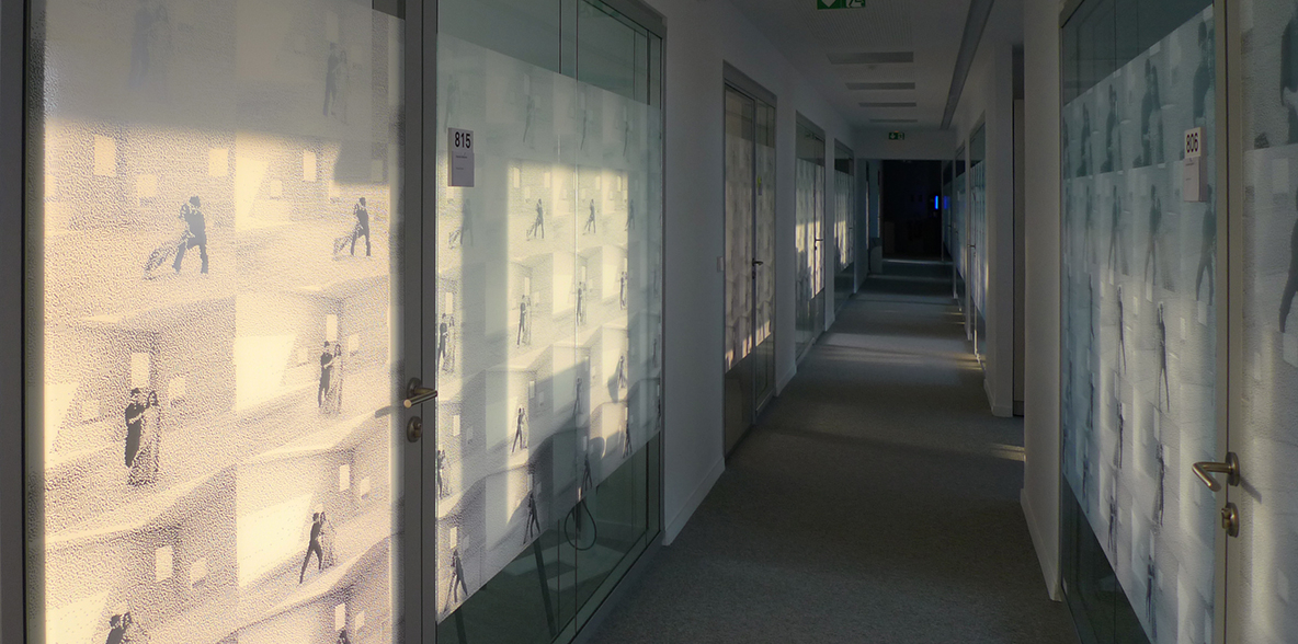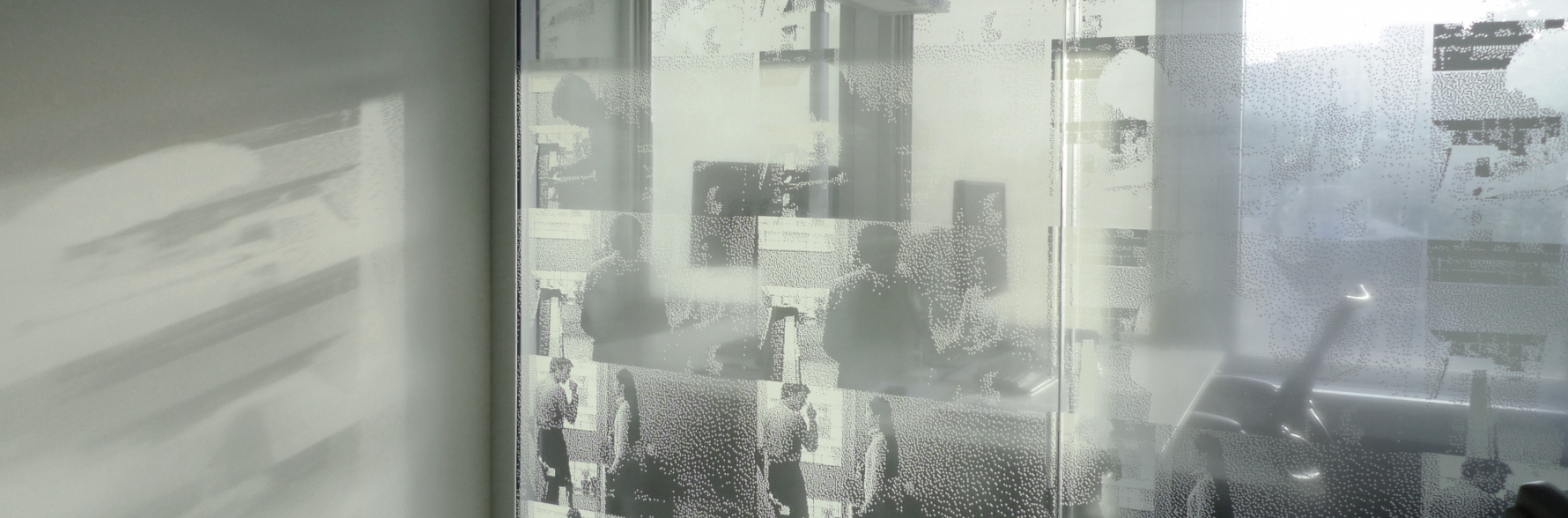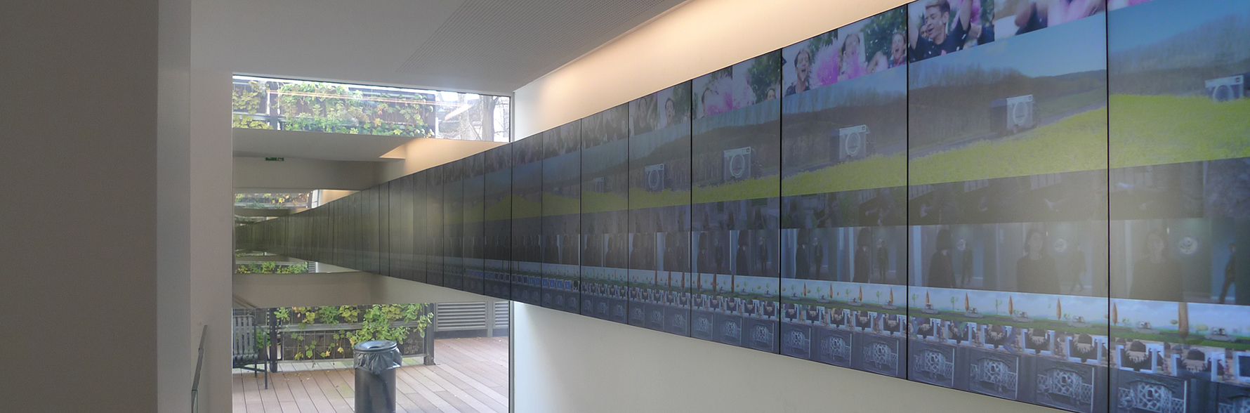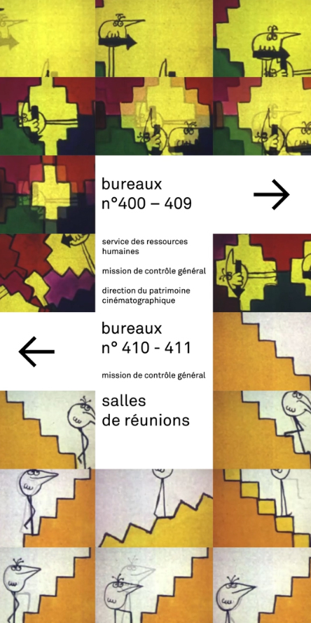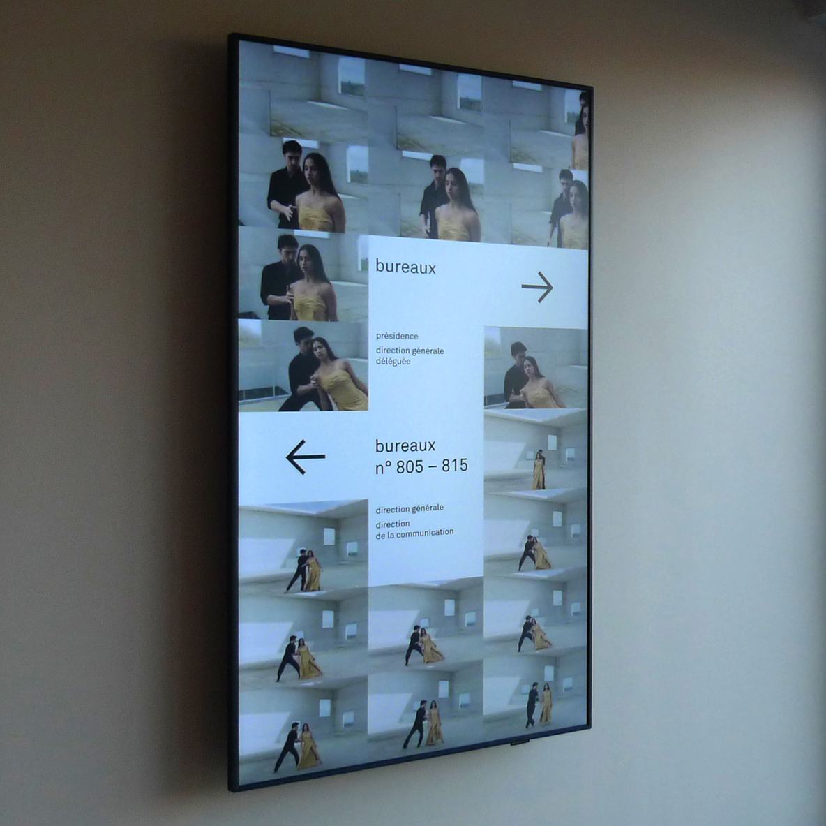 Dans la prolongation de l’identité visuelle, nous avons cette fois utilisé le séquençage vidéo notamment pour masquer les espaces de travail : chaque surface horizontale présente un film emblématique, découpé de telle manière que le fait même de se déplacer actionne le film : c’est l’utilisateur des espaces qui active les images.