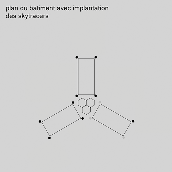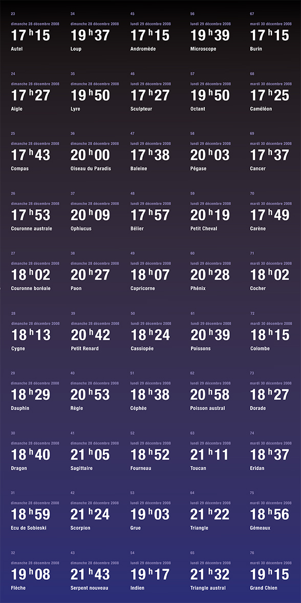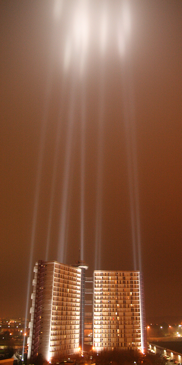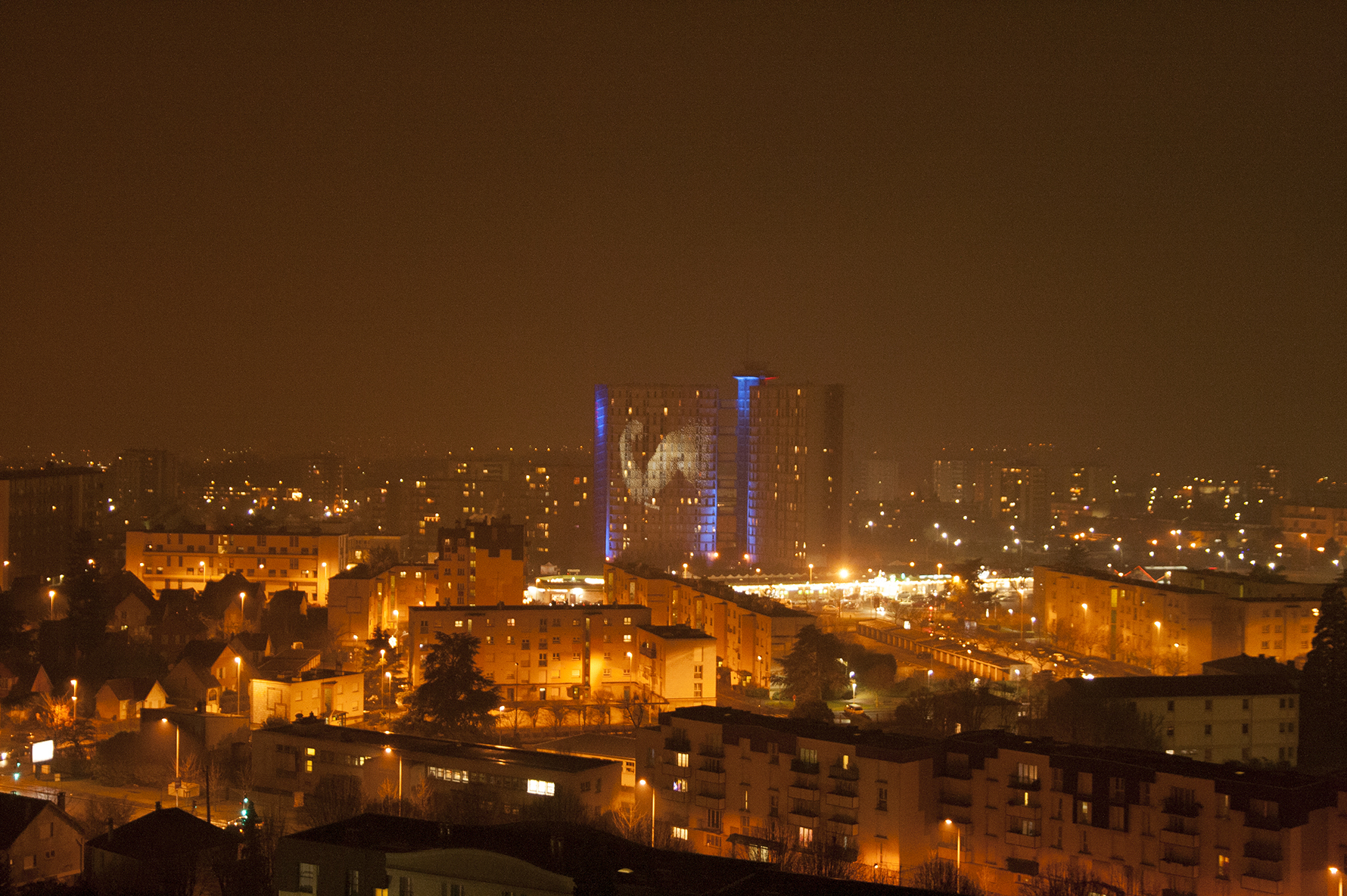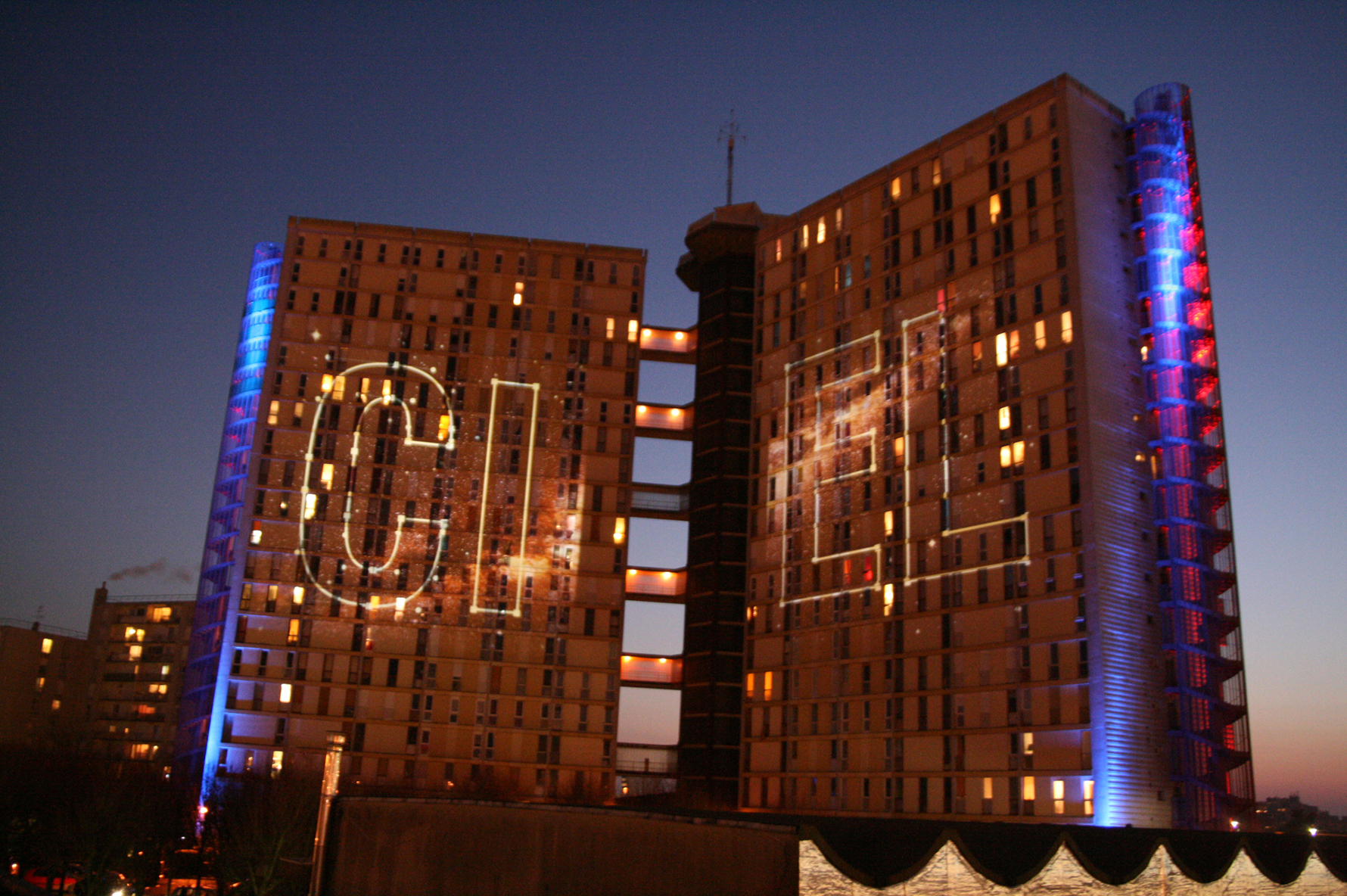 Pour le festival « Dépayz’arts », nous nous sommes associés à Gelatic, société de réalisation de décors et d’éclairages. À l’occasion de ce festival de la Seine-et-Marne, nous avons orchestré une vaste opération d’éclairage des immeubles d’habitation du quartier « Plein Ciel » à Le Mée : une série de projections qui inscrivent dans un paysage urbain relativement ingrat (des barres HLM) des images de toutes sortes : mots, boussoles, gestes, animaux. Une nouvelle constellation descendue sur terre, l’idée étant d’activer mentalement une projection dans la verticalité, de travailler l’étirement virtuel, la montée dans l’espace, l’envol de l’immeuble, d’imaginer sa « ciellisation »…