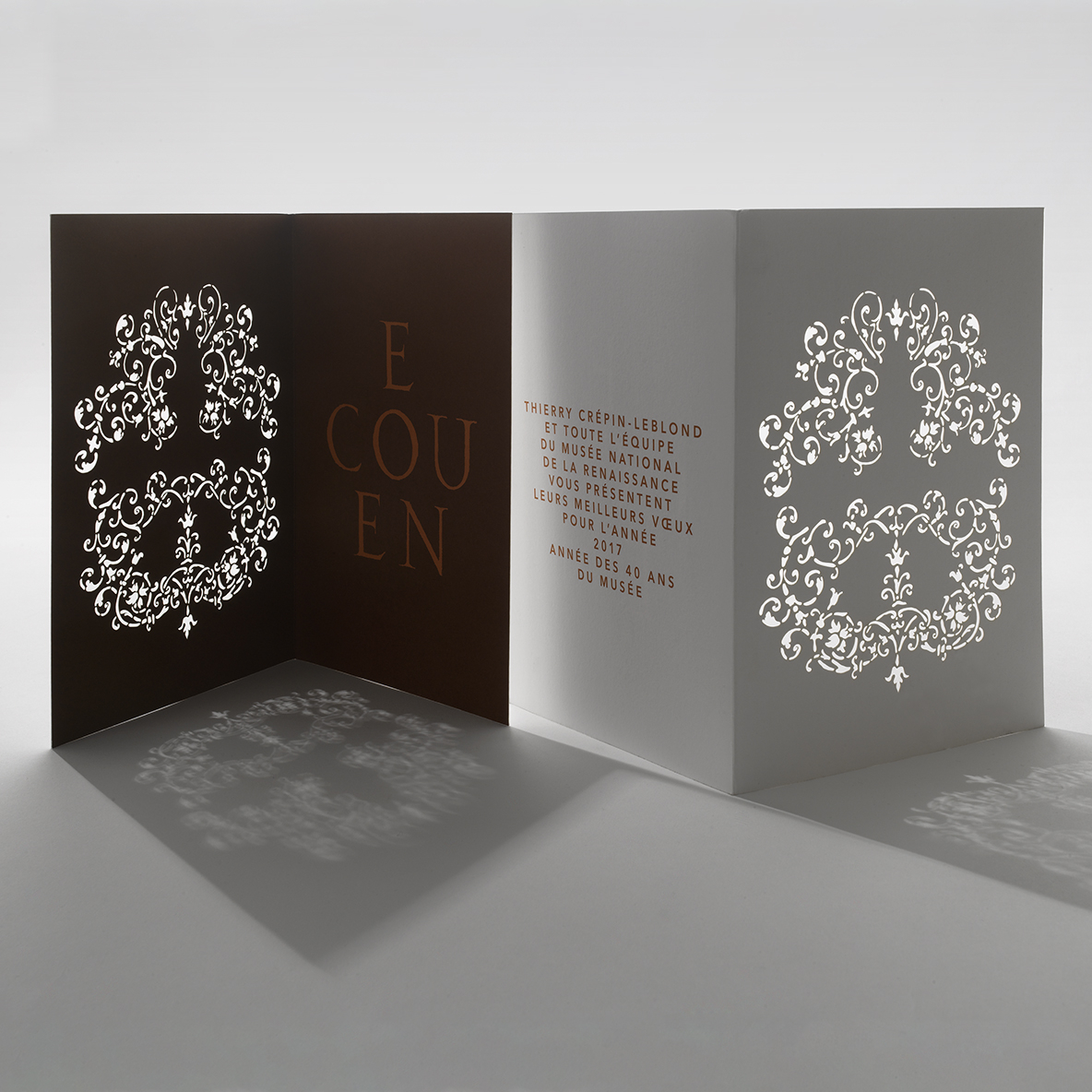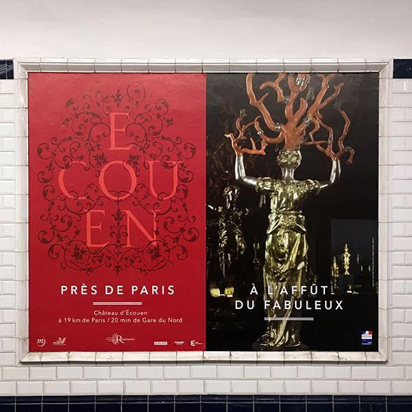 En 2015, la RMN décide de consacrer un budget exceptionnel pour la communication institutionnelle du musée d’Ecouen, très proche de Paris et pourtant méconnu du public. En charge de la campagne d’affichage, nous travaillons trois concepts avec Véronique Vienne, auteure et rédactrice, qui donneront lieu à trois thèmes et trois accroches. Côté graphisme, nous souhaitons évoquer la magie de la renaissance qui fait toute la beauté du château d’Ecouen. C’est pourquoi nous nous inspirons de la typographie de Geoffroy Tory qui sera numérisée pour créer le typogramme, que nous agrémenterons de rinceaux, motifs floraux très en vogue à la renaissance, et qui évoquent l’écrin végétal qui entoure le château-musée. Les photographies sont elles réalisées en collaboration avec Philippe Migeat.