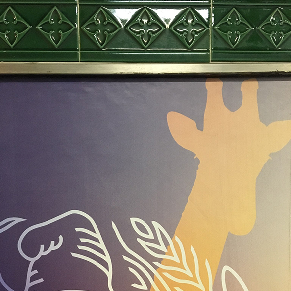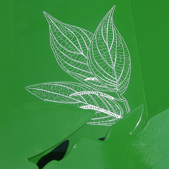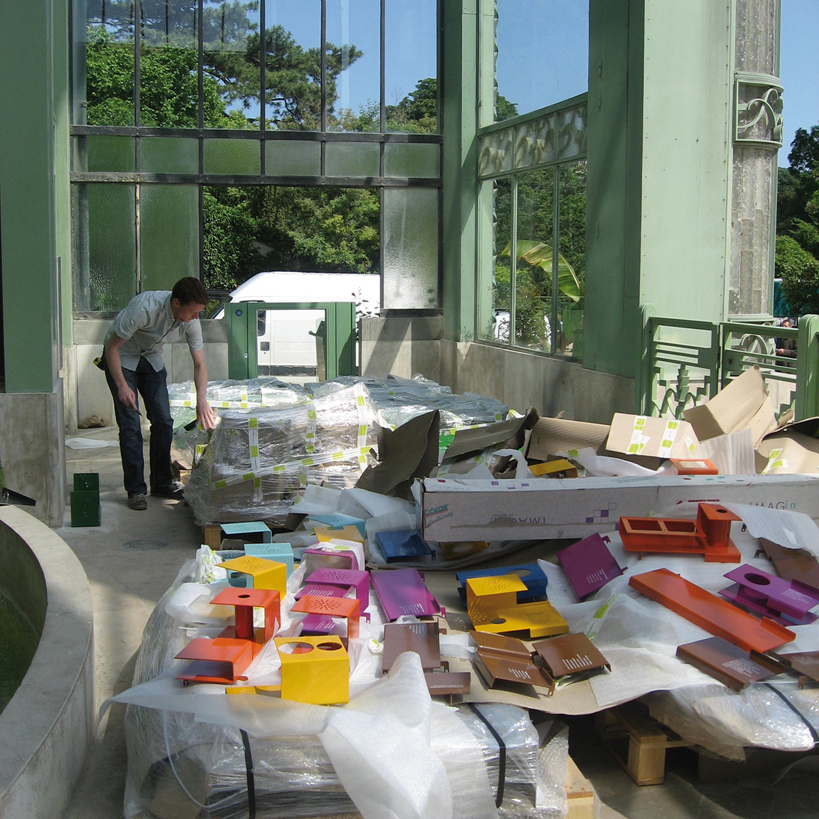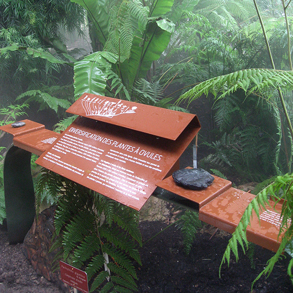 Pour la réouverture des serres du Jardin des plantes, nous avons conçu des panneaux dessinant plusieurs parcours. Chaque panneau dispose d'une découpe spécifique rappelant une plante particulière, dont on découvrait ainsi l’évolution, la famille, etc. Afin de ne pas perdre le visiteur, on a souhaité éviter l’effet « forêt de panneaux ». Ceux-ci étaient donc camouflés au maximum, le travail de la découpe visant à les confondre avec la végétation, selon une logique proche du camouflage : les informations sont bien là, mais elles ne gênent jamais la découverte des plantes, les vraies vedettes du lieu. Les différents panneaux sont accrochés à une « liane » artificielle, longue plaque ondulée qui dessine le parcours de la visite, à demi cachée parmi les plantes. Elle se rapproche du végétal pour mieux s’y fondre...