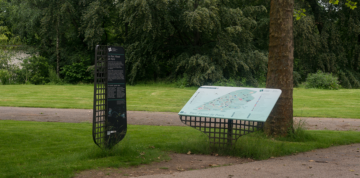 Notre approche était de permettre au visiteur, amateur ou spécialiste, d’entrer dans une démarche de découvertes à tout moment de la promenade et en toute saison, le principe étant d’intégrer les collections, la signalétique et le mobilier à leur environnement. Nous ne souhaitions pas limiter les cheminements à une trajectoire définie mais offrir plusieurs sens de circulation permettant au visiteur d’emprunter son propre chemin en toute liberté, en y apportant les éléments nécessaires à son orientation, les éclairages et les informations directionnelles et pédagogiques.