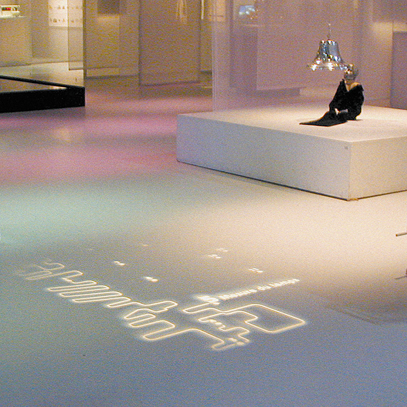 Le parcours de l’exposition est projeté au sol, à chaque seuil, comme pour marquer l’ouverture d’un nouveau « chapitre ».