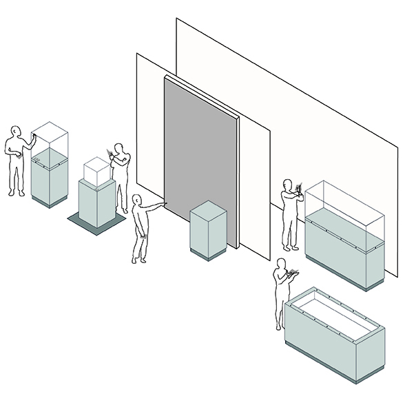 S’il est question de « chapitre », c’est donc qu’un livre accompagne l’exposition. Un vrai livre, pas un simple dépliant, qui assure le travail signalétique tout en étant un véritable objet d’édition. Nous faisons notre possible pour baisser les coûts au maximum (impression, papier, etc.), tout en proposant un bel objet, à choisir parmi une multitude de teintes (pour la couverture).