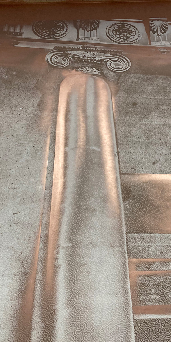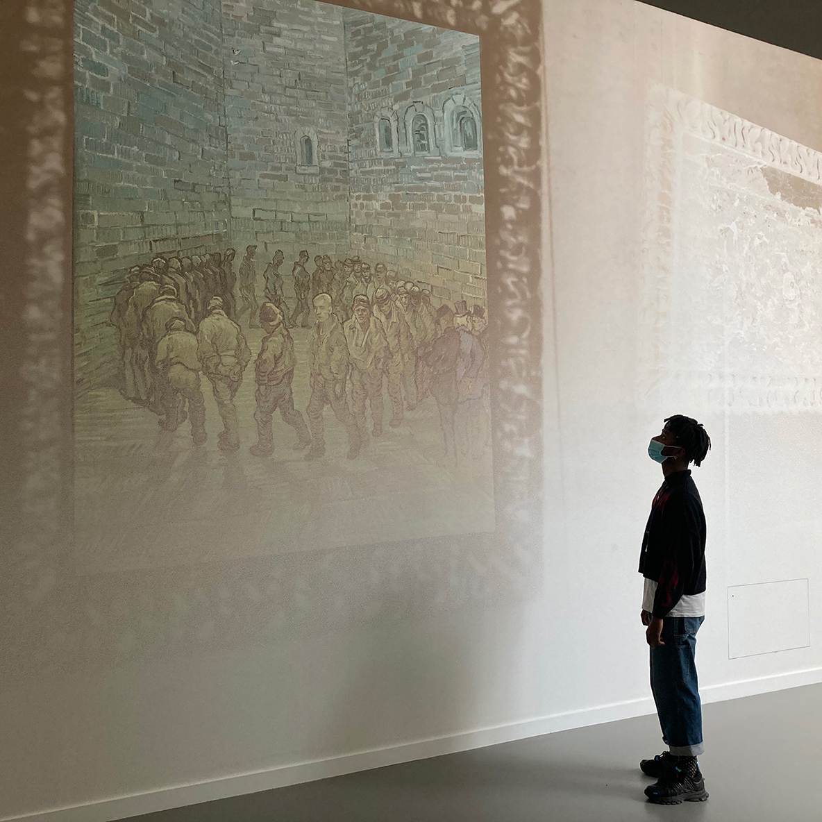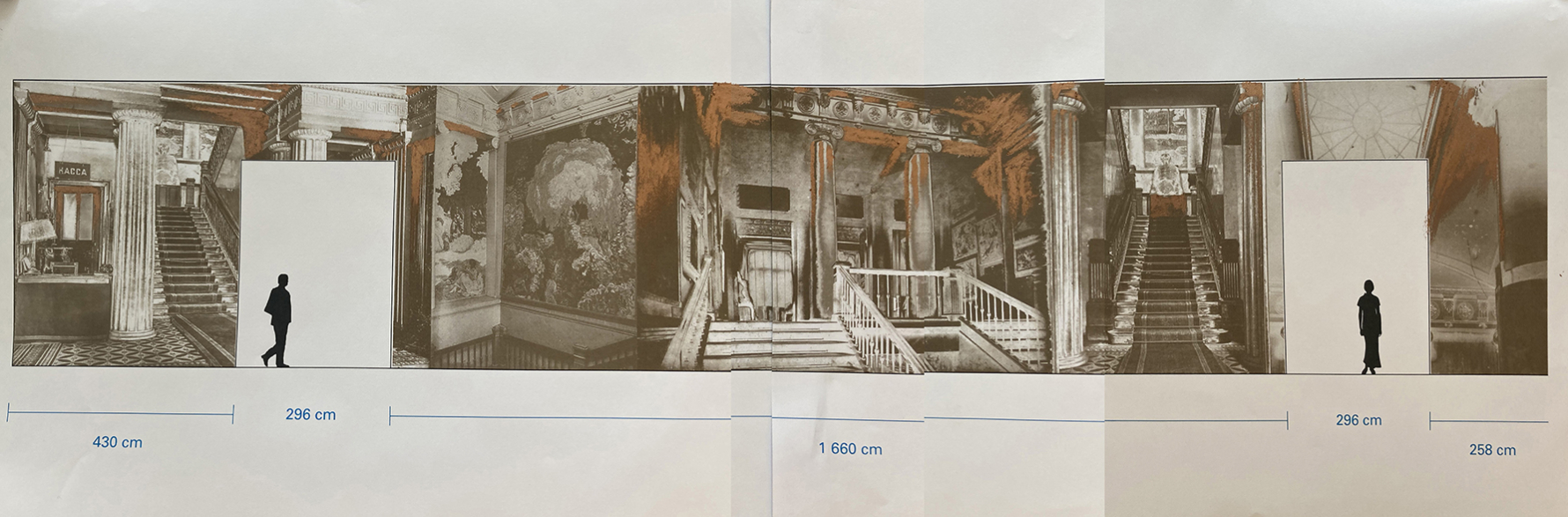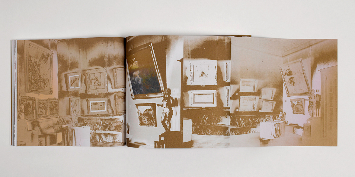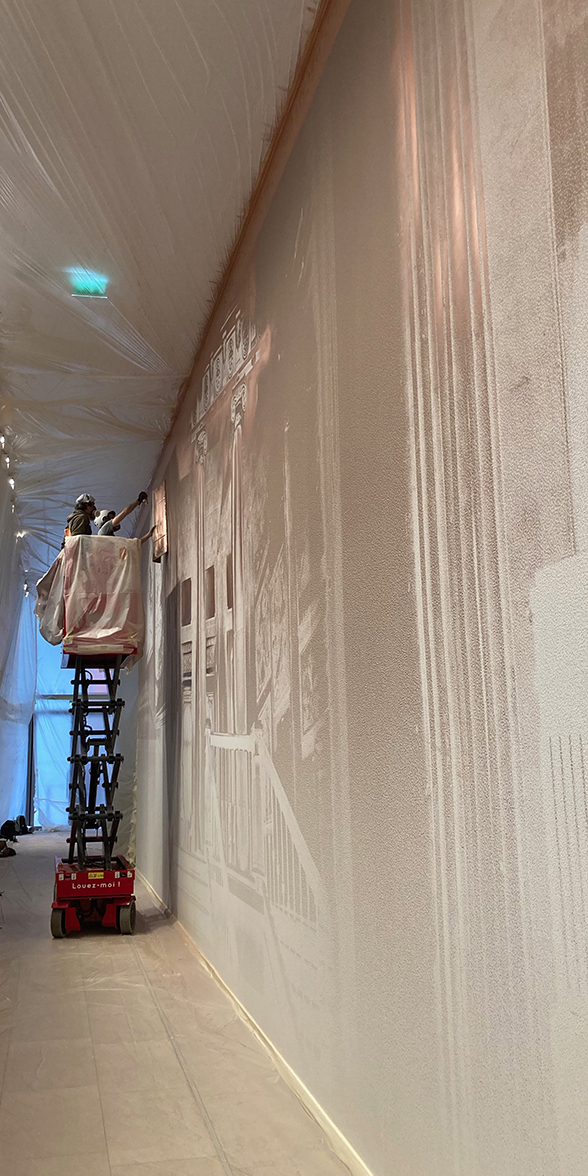 Après l’immense succès de l’exposition « Icônes de l’art moderne, la collection Chtchoukine », c-album s’est vu confier à nouveau la conception et la réalisation du catalogue de l’exposition « la collection Morozov ». Cette fois aussi, nos créations visuelles basées sur les photographies d’archive de l’hôtel particulier d’Ivan Morozov ont été tirées en très grand format pour faire partie de la scénographie. Mais en plus, nous avons peint ces fresques gigantesques, sur place, à l’aide de bombes aérosols dorées, afin d’amener de la matière au décor, et une certaine lumière, comme venue du passé, et qui évoque un palais fantomatique.