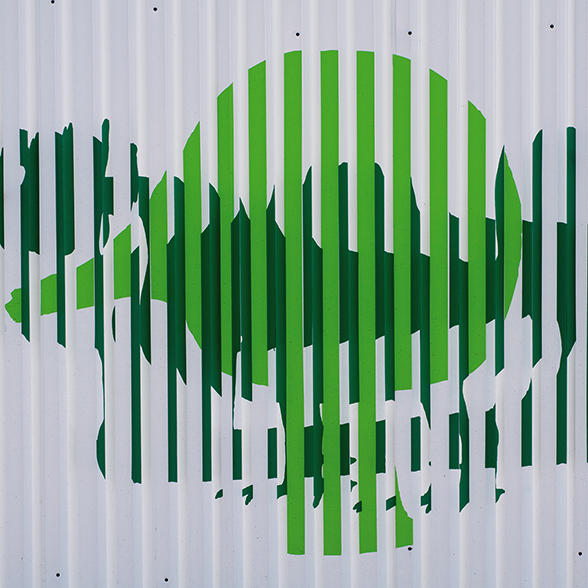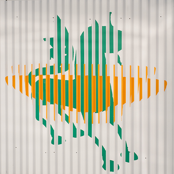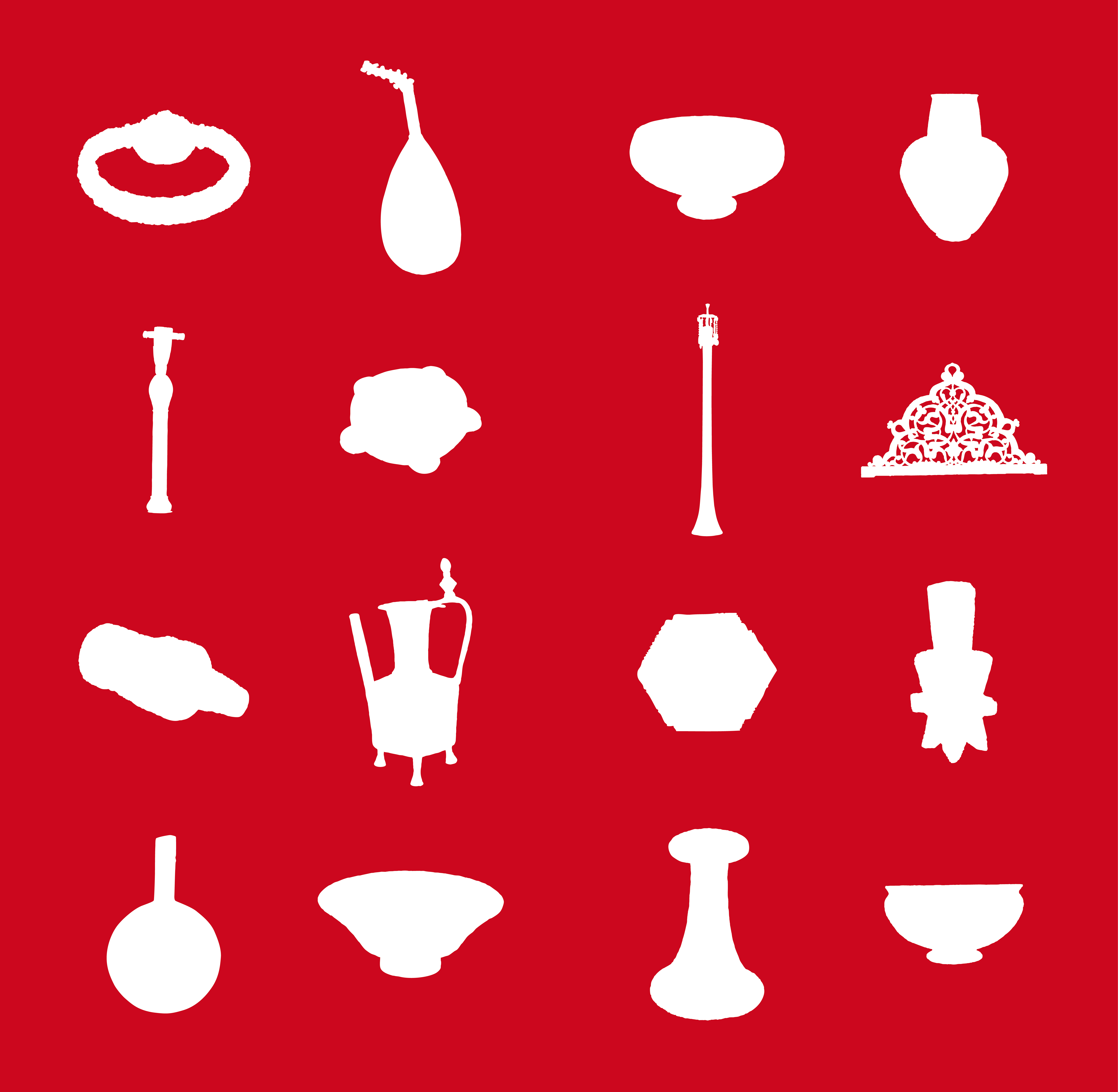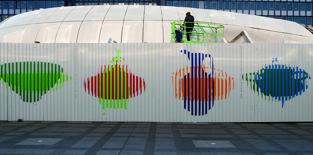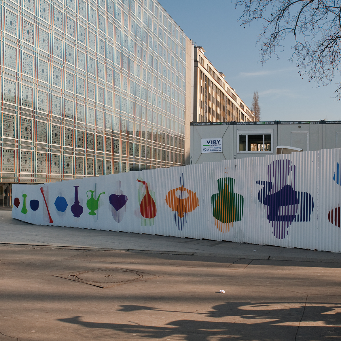 L’Institut du monde arabe devant faire peau neuve, l’occasion nous était donnée d’habiller une palissade. Les nécessités du chantier (protéger, séparer, recouvrir) rendaient possible un geste de communication, rappelant les merveilles des collections du site, par-delà l’aspect peu attrayant des travaux. Qui plus est, une palissade elle-même décorée est moins rapidement taguée qu’une simple bâche de chantier ! Le visuel proposé joue de la forme même des barrières de sécurité, la tôle ondulée : les silhouettes des objets des collections permanentes sont réinterprétées selon la mode du cinétisme. La couleur devient rythme. Le visuel plaît, on le reprend pour la carte de vœux 2011 de l’Institut.