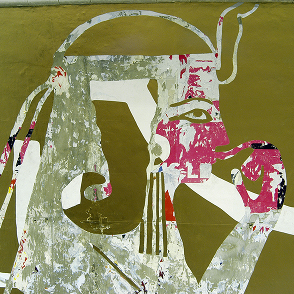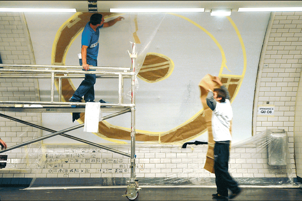 La fresque est ensuite creusée au cutter, dans l’épaisseur des affiches publicitaires accumulées au fil des semaines : après le nom, c’est l’image elle-même du pharaon (son «corps») qui apparaît enfin.