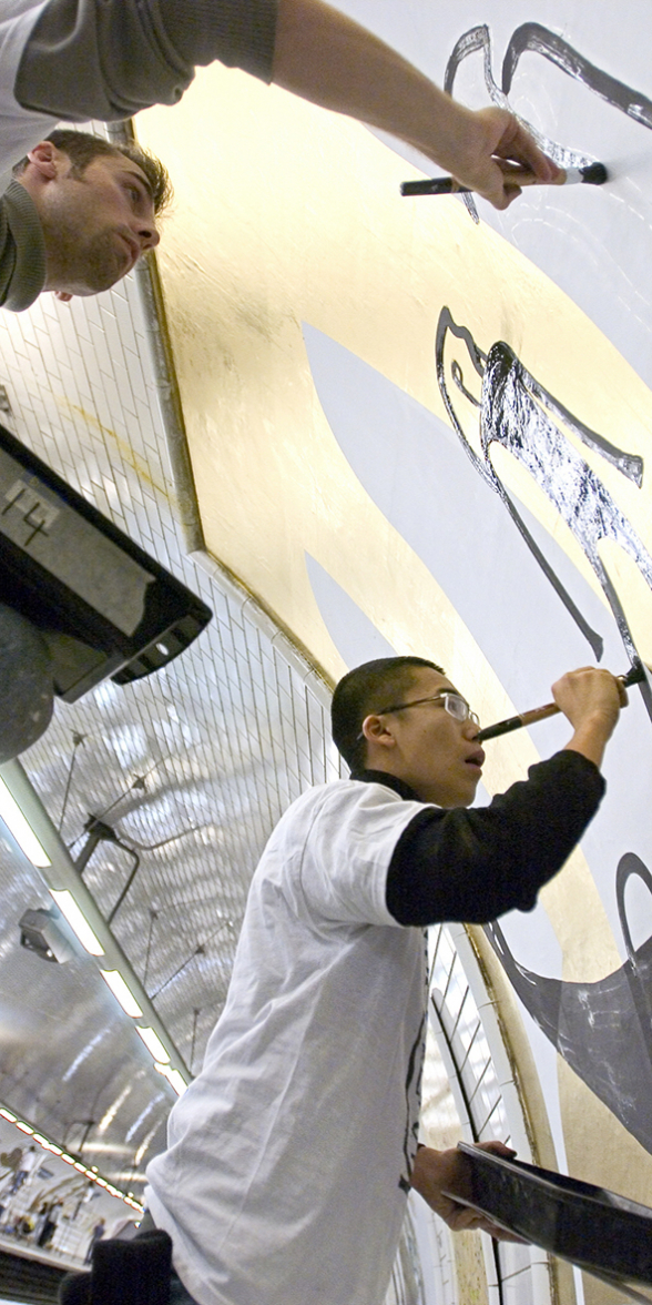Pour cette opération, nous avons travaillé en synergie avec l’Institut du Monde arabe l’institut du Monde arabe, la RATP et l’École des Arts décoratifs. Afin de prolonger la communication autour d’une exposition à succès (« Pharaon », à l’IMA), nous avons choisi de magnifier une écriture visuelle propre à l’Égypte ancienne (les cartouches et les hiéroglyphes), en les inscrivant au sein des espaces typiques de l’univers métropolitain : à même les carreaux de faïence, ou en « creusant » les affiches 4 par 3. Le tout, bien sûr, à la station Pyramides.