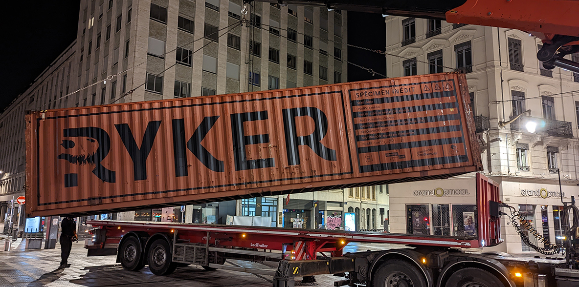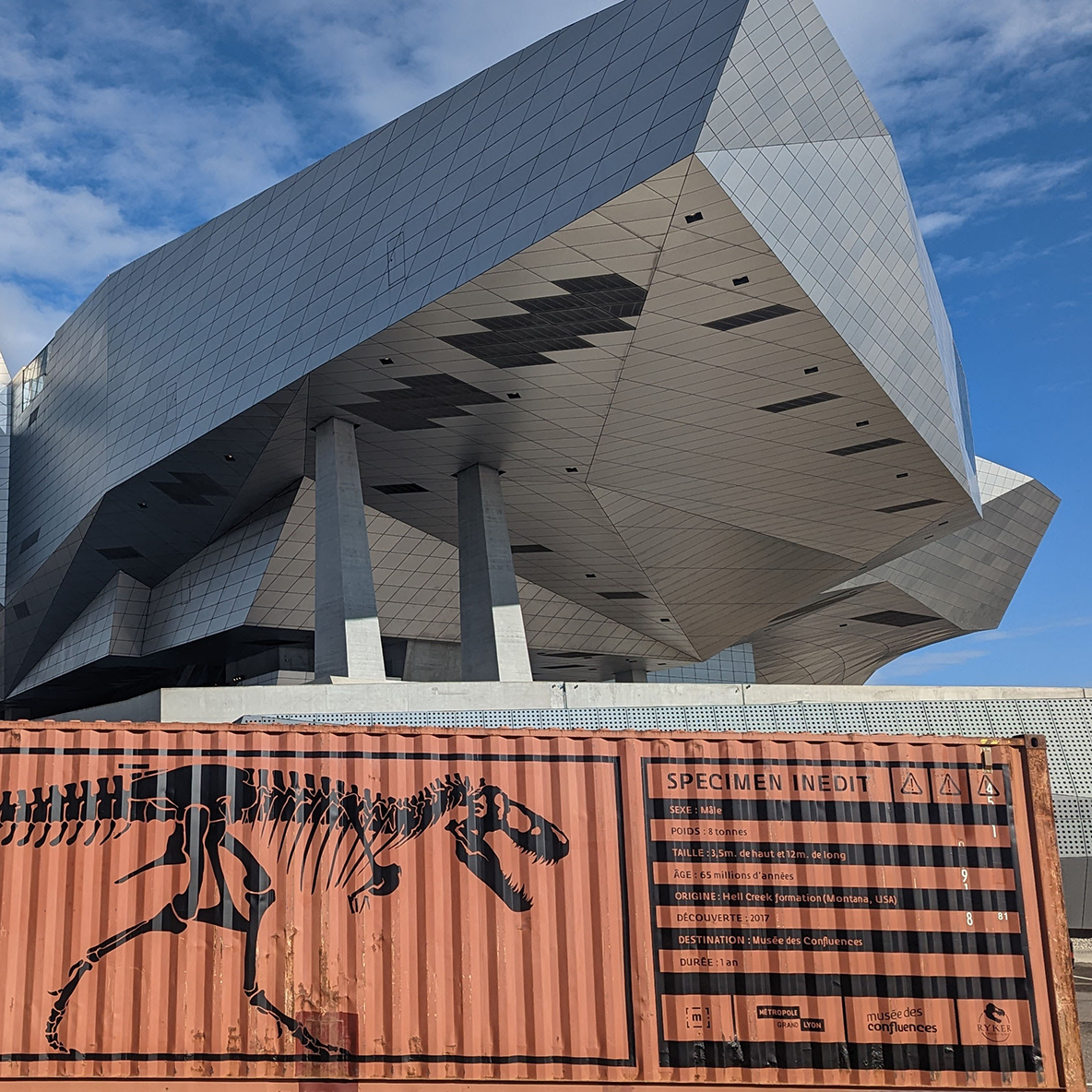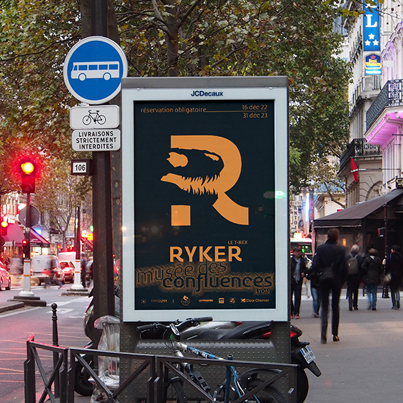 Ce projet annulé devait présenter un T-Rex découvert en 2021 et complet à 74%, ce qui en faisait le mâle le plus complet au monde. Pour sa présentation au Musée des Confluences, nous étions en charge de la communication graphique globale de cet évènement majeur : campagne d’affichage classique, écrans animés numériflash, habillage de tramways, flyers, cartons d’invitation etc… et en guise de teasing, le musée souhaitait installer un conteneur dans la ville, qui aurait été égaré et contiendrait la bête féroce et rugissante…