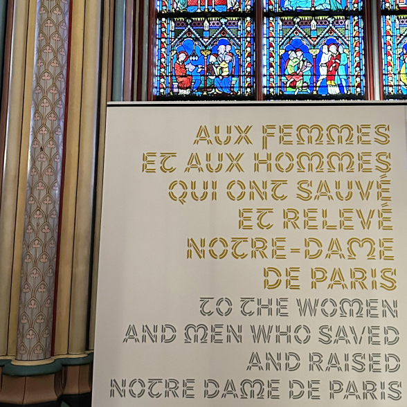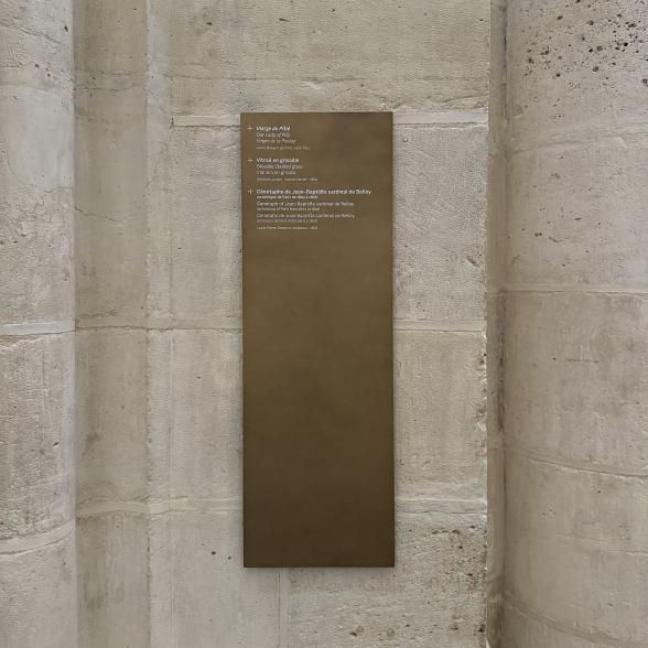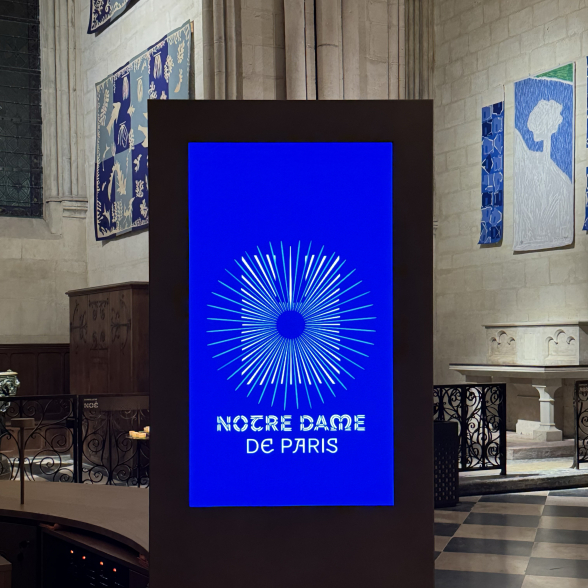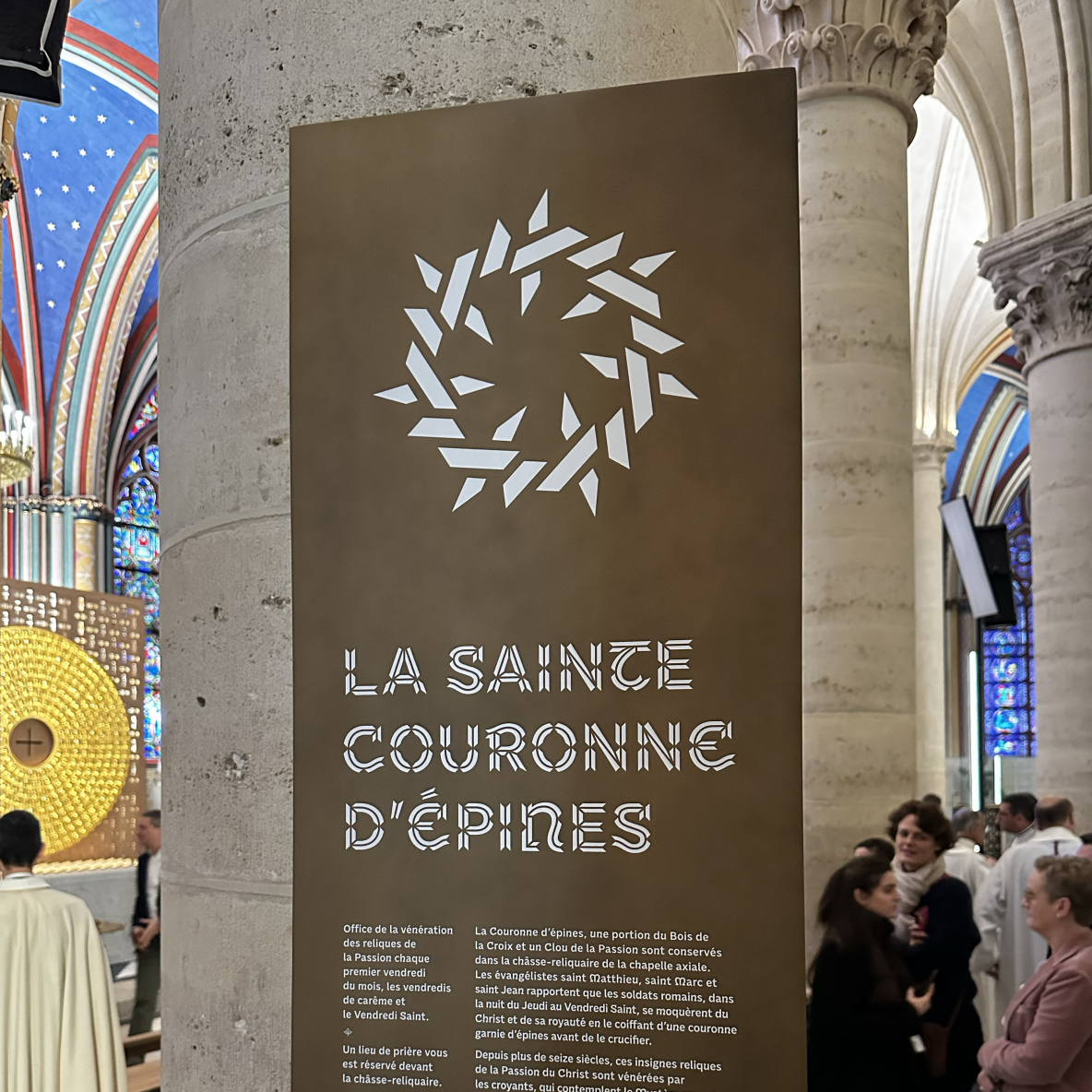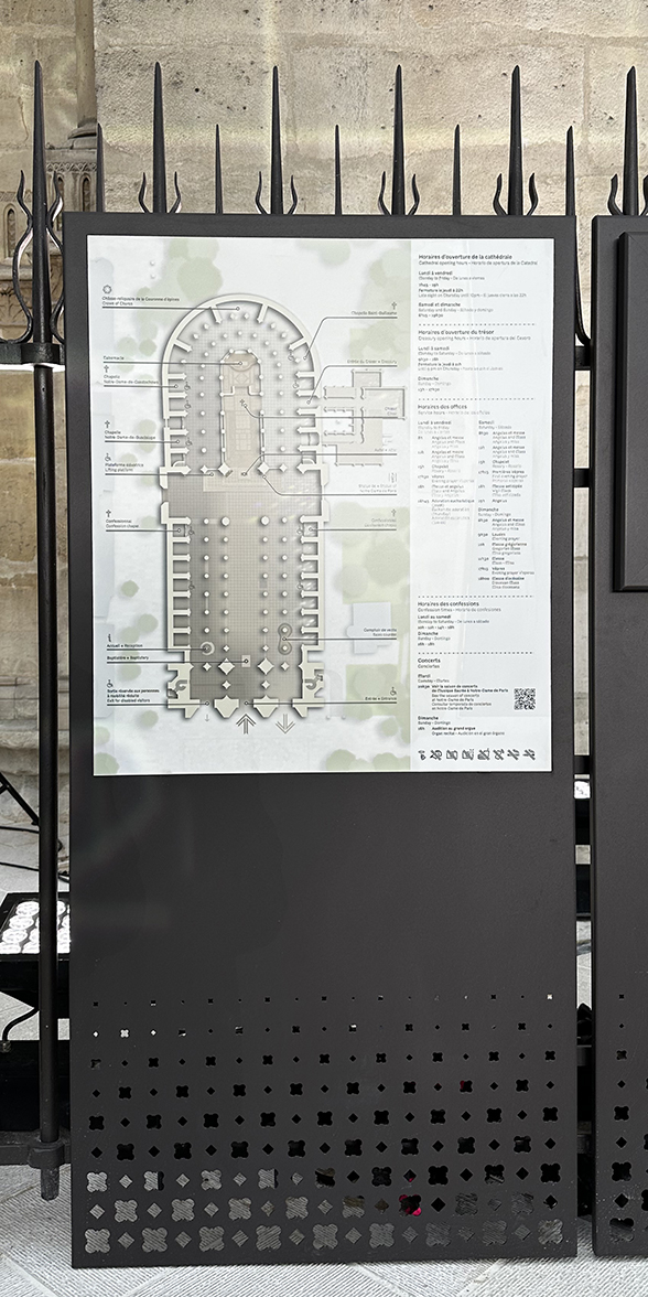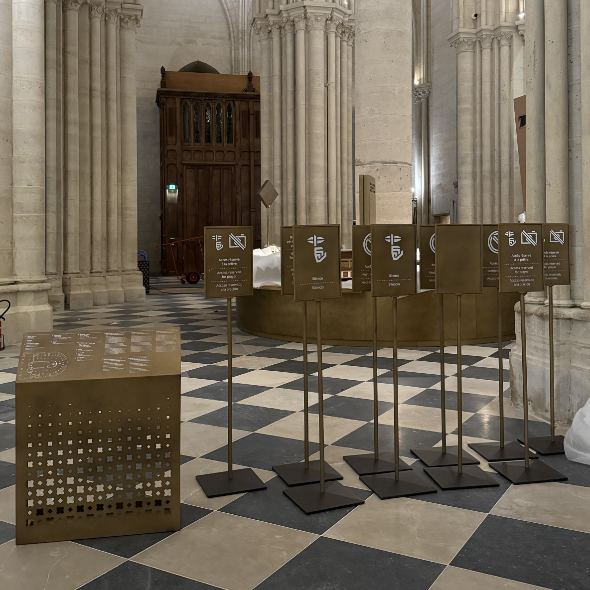 Le mobilier signalétique, à la fois visible, discret et fonctionnel, permet d’unifier l’ensemble des messages au sein de Notre-Dame.
