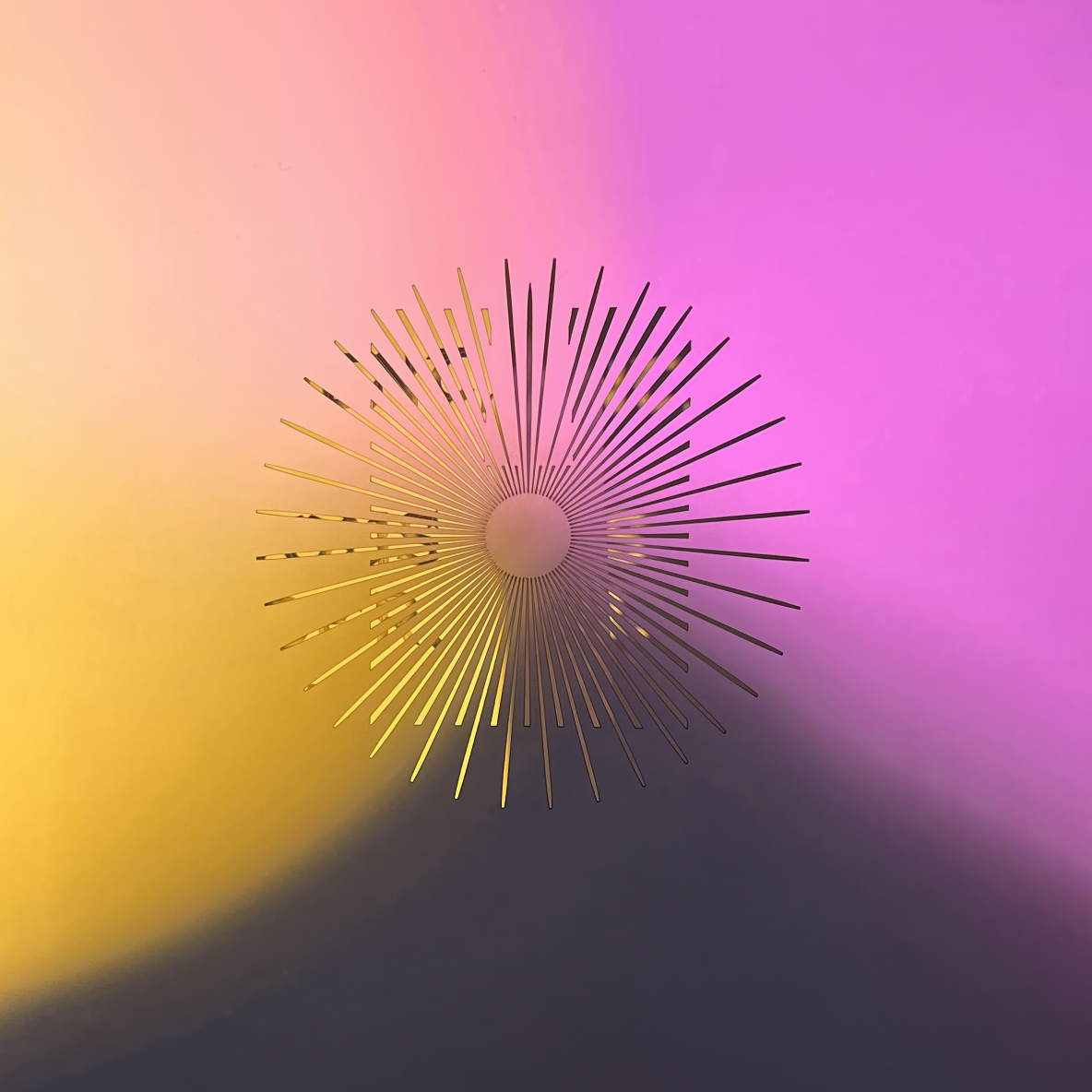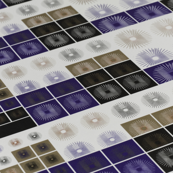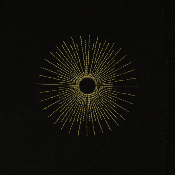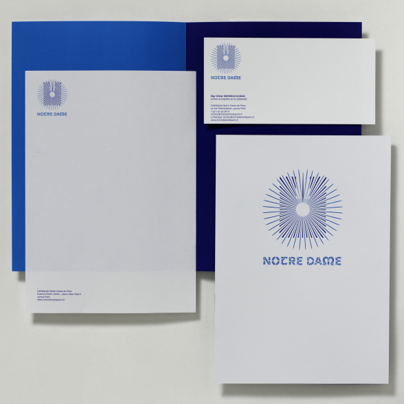 Nous conservons les contours rectilignes de la façade, évoquant un lieu d’accueil et de refuge, ouvert à tous. À cette silhouette, nous avons superposé le cercle de sa rosace centrale, d’où fusent 40 rayons, référence biblique et signes de la renaissance après l’épreuve, et qui invitent universellement au partage du mystère chrétien.
