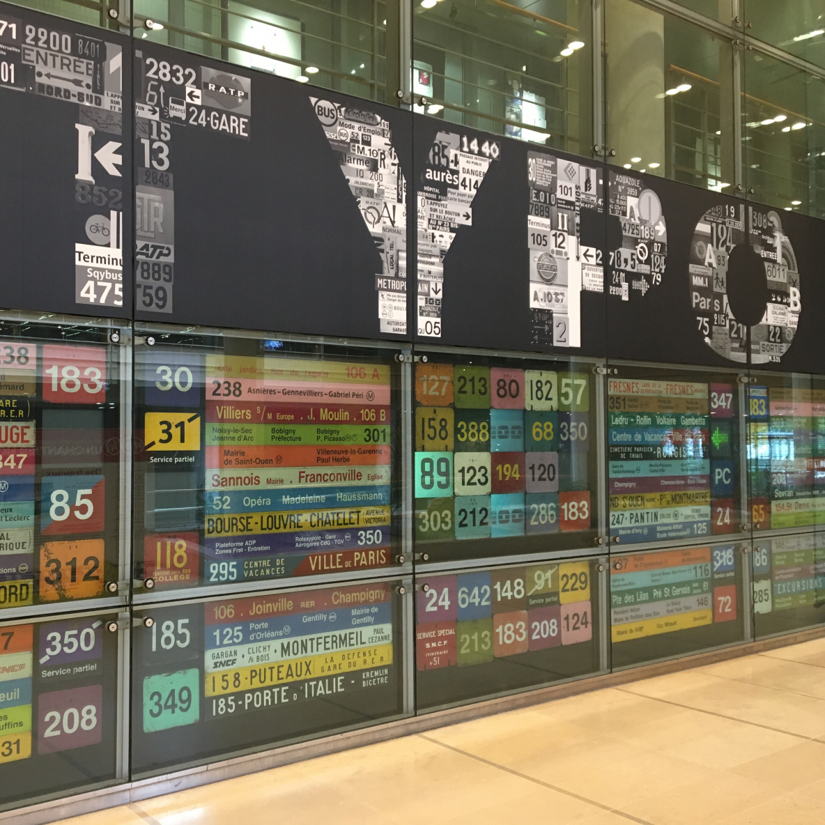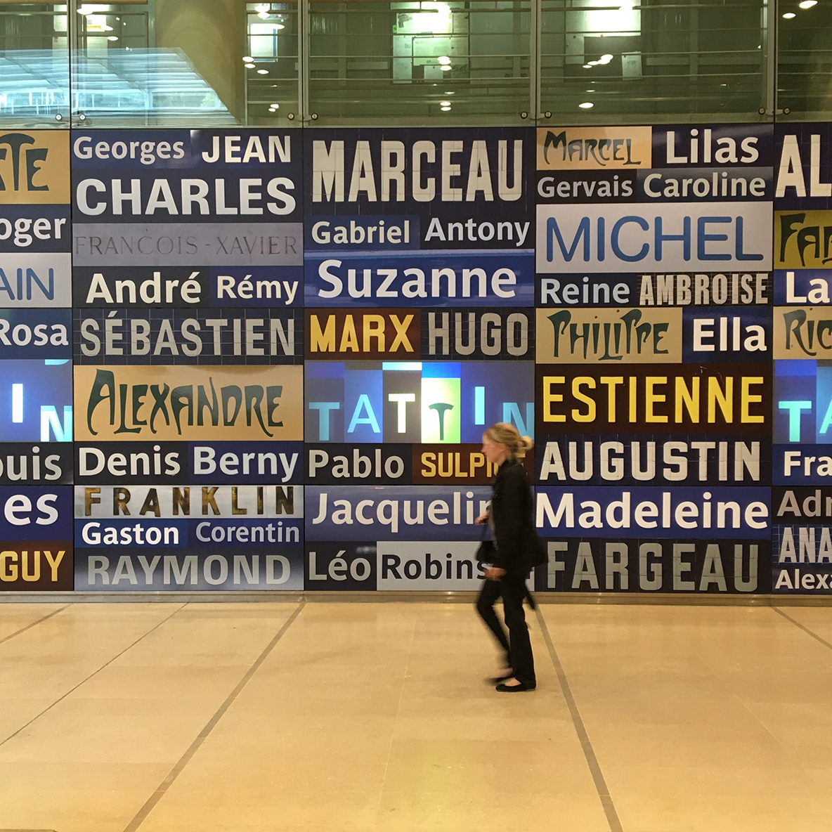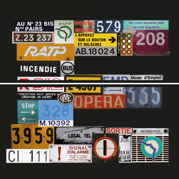 La signature d’une ville, comme Paris ou Londres, se trouve avant tout dans ses transports, avec tout ce qu’ils comportent comme indications graphiques. C’est forts de ce constat et grâce à l’incroyable collection patrimoniale de la RATP que nous avons réalisé l’exposition « typographie », miroir de la culture du signe dans les bus et métros parisiens. En répertoriant tout d’abord tous les prénoms présents dans les noms de stations, on constate à quel point la typographie varie selon les époques et les supports. Il n’y a en effet pas de charte graphique aux débuts du métropolitain, et c’est ainsi qu’on retrouve le glyphe si particulier d’Hector Guimard à certains endroits alors que dans le même temps, les artistes céramistes adaptent les lettres aux formats des petits carreaux blancs et bleus si distinctifs du métro parisien, selon la longueur des noms des stations. Il faut attendre la fin du XXe siècle pour que la RATP se dote d’une typographie dédiée : la parisine.