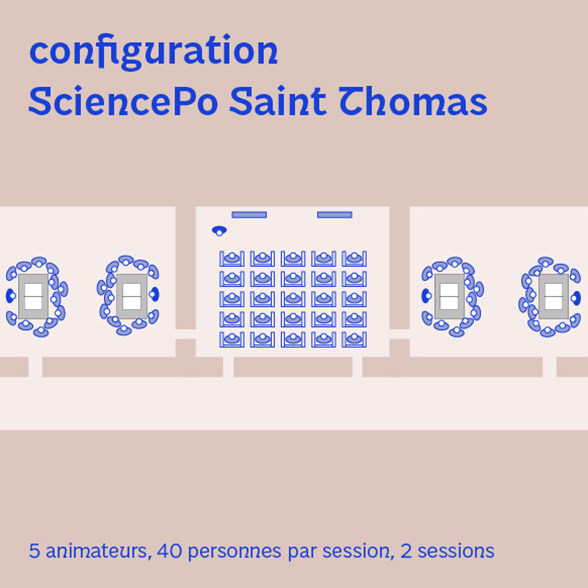 disposition : deux salles en mode tabula (2X2 blocs de 2 tables) + une salle en mode conférence